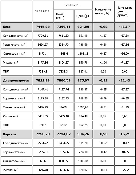 С 16 по 23 августа 2013 г. прайсовые цены на листовой прокат в Украине понизились. Об этом свидетельствуют данные index.ugmk.info.